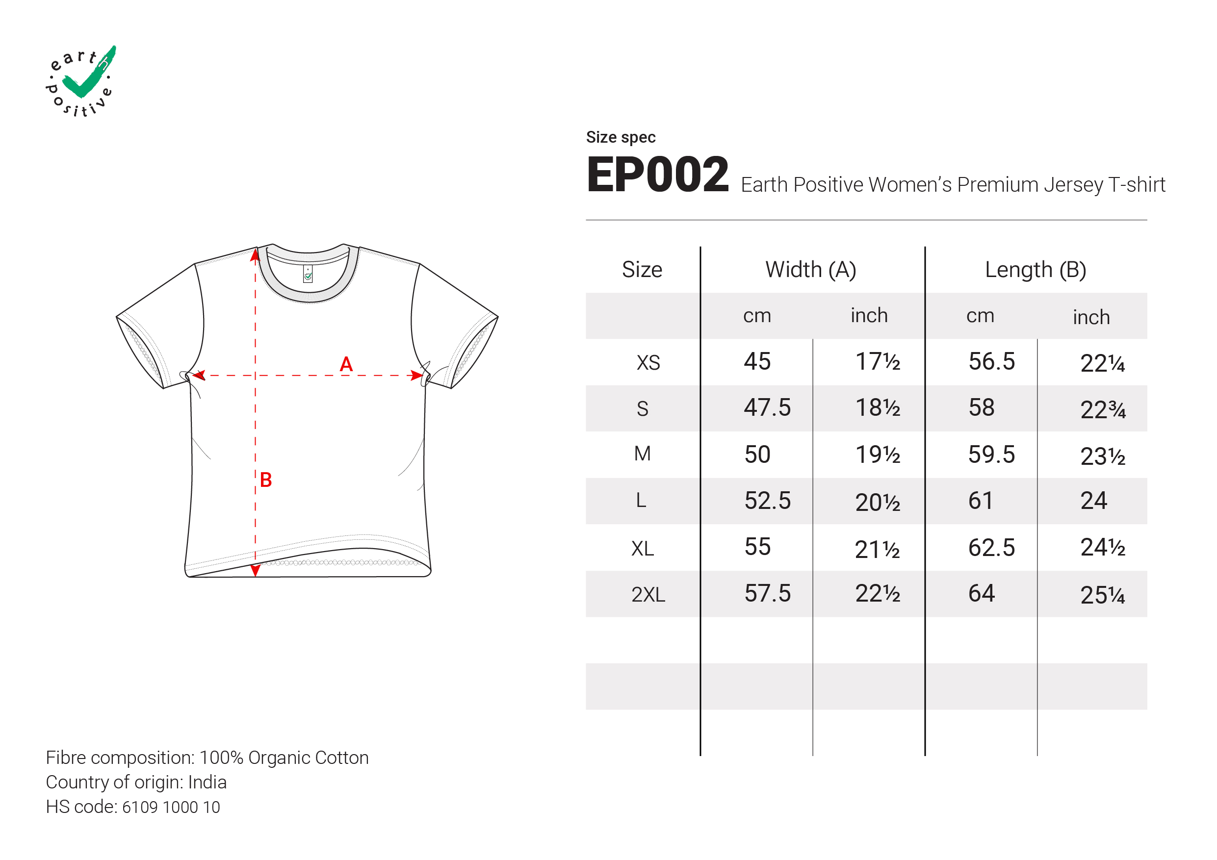 The Earth Positive® Women’s Premium Jersey T-Shirt offers an updated take on the EP02 Classic Unisex T-Shirt, designed for those who prioritise comfort and responsible design. Made from 100% organic cotton, this style is produced in a heavier 185 gsm jersey, delivering a more substantial feel with improved durability.