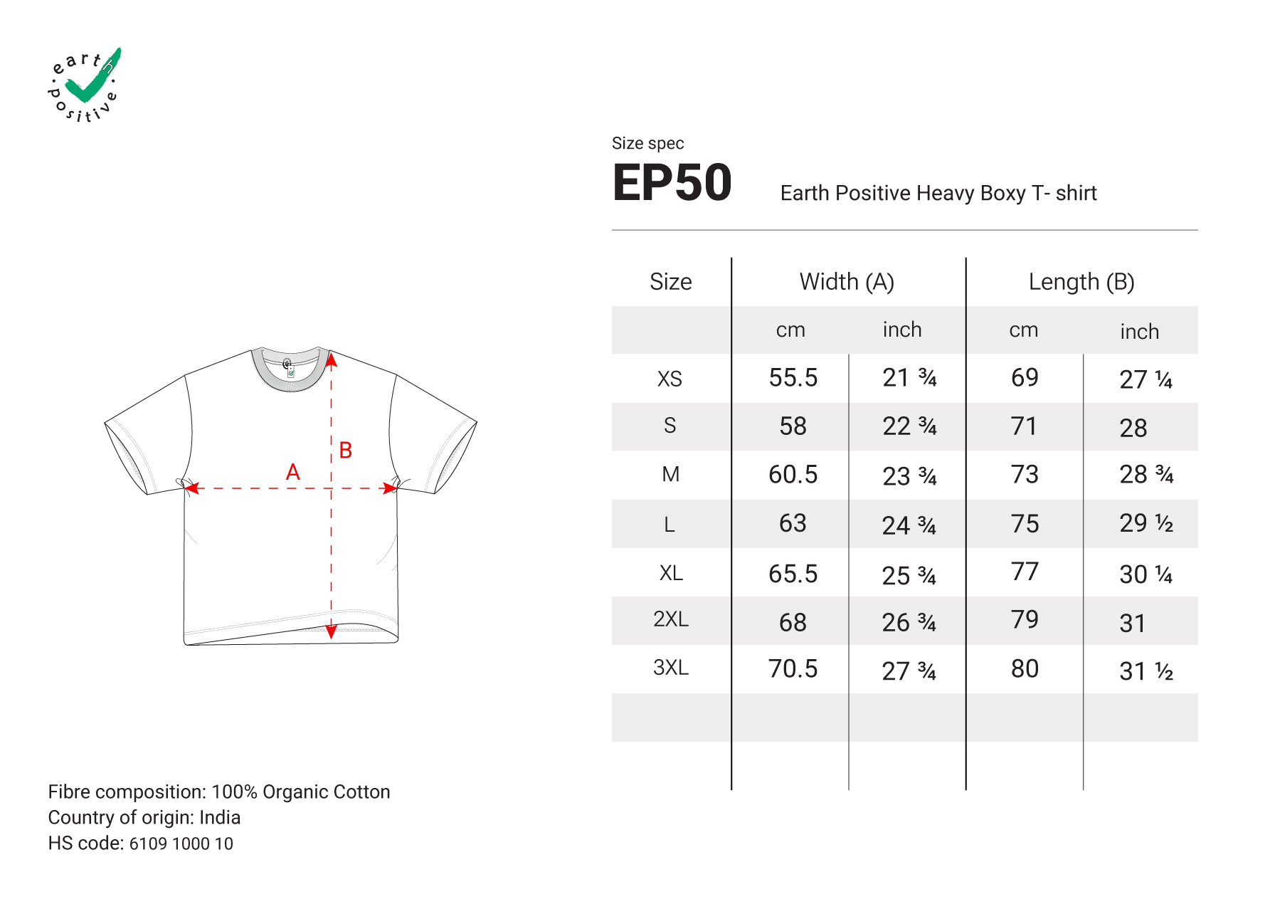 The EP50 is a heavyweight T-shirt that balances comfort, modern style, and responsible production. Made from 100% organic cotton at 220g/m², it delivers a solid, premium handle and features a boxy, oversized fit that creates a clean, contemporary profile.